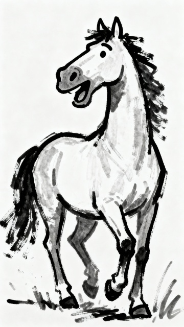 水墨风与卡通感结合,拟人化马儿展露欢愉神情,笔触灵动,尽显传统韵味与童趣创意。