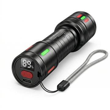 背景是夜晚森林中的地上,一支黑色战术手电筒的特写,一半的体积被雨水浸泡在水中(从地面泼溅而起,激起水花,水花晶莹剔透,折射着光线),背景是森林。