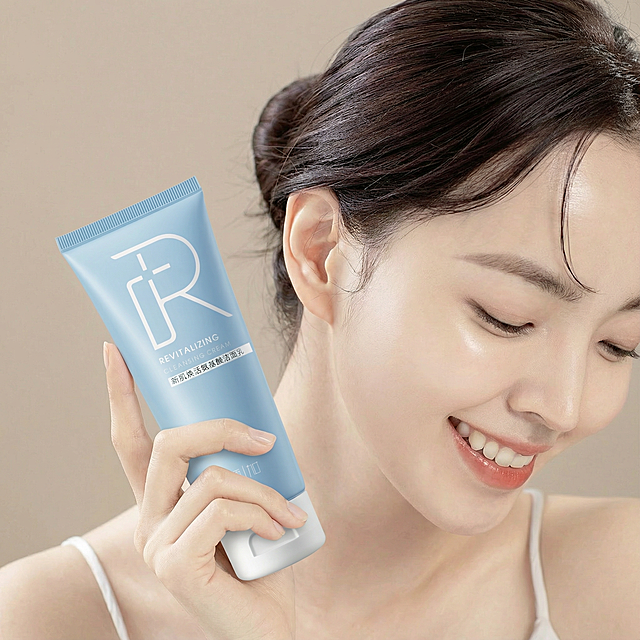 [主图3 质地肤感展示] [主图主题] 院线洗护温和质地展示 [氛围/风格] 干净清新,水润自然,柔光质感 [画面元素] 微距特写肤宁洗剂挤出的绵密细腻泡沫,泡沫蓬松柔软,产品瓶身在后方作为背景虚化衬托,背景为浅米色水润瓷砖,带有自然水雾氛围感,光影柔和通透,突出泡沫绵密细腻质感。 [配色色系] 主色调:浅米白,辅助色:泡沫白色,产品蓝色点缀 [视角构图] 平视微距特写,主体泡沫居中 [文字版式] 主标题 "绵密泡沫 温和清洁",副标题 "洗后不紧绷 温润亲肤",字体为细体无衬线,字色深灰,文字悬浮在画面左上角留白处,不遮挡泡沫主体。 [比例分辨率] 2k分辨率详情