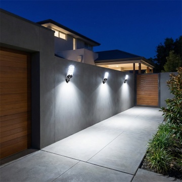 现代简约风格的庭院,阳光明媚的白天,晴朗的蓝色天空点缀着几朵白云,庭院内有一栋两层现代简约风格的白色住宅,住宅外立面有大面积玻璃窗和深色框架,木质大门,门前有几级浅色石阶,周围种植着修剪整齐的绿色灌木、高大的树木和草坪,草坪上有石板小径,整体光影明亮,色彩清新自然,营造出宁静舒适的氛围。
