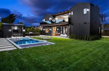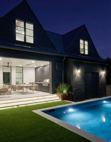 现代简约风格别墅外观,黄昏时分,深蓝色渐变天空,建筑采用水平线条设计,大面积落地玻璃窗透出温暖室内灯光,二层悬挑阳台带玻璃护栏,外墙结合浅色石材与平滑涂料,底部石材墙面纹理清晰,周围环绕修剪整齐的绿色草坪、低矮灌木和高大树木,地面铺设灰色石板台阶,建筑轮廓有嵌入式暖黄色LED灯带照明,光影对比柔和,整体呈现宁静高端的居住氛围,不同样式的现代别墅设计,注重几何感与自然环境的融合。