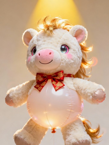 软3D风萌趣小马,毛发生长质感搭配充气肚皮,红金祥云蝴蝶结点缀,光影梦幻交织,尽显可爱卡通与喜庆氛围。