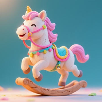 软3D粘土风格的可爱独角兽摇马,粉色鬃毛与甜美元素交织,充满童趣与梦幻感,适合儿童节主题设计。