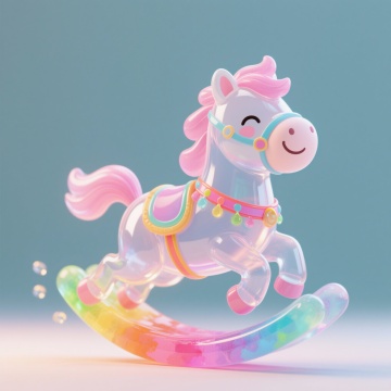 梦幻感十足的软3D风格摇摇马,透明玻璃质感搭配彩虹底座,粉色鬃毛与可爱表情营造甜蜜卡通氛围,清透体积感与塑料风设计交织出童趣治愈的视觉体验。
