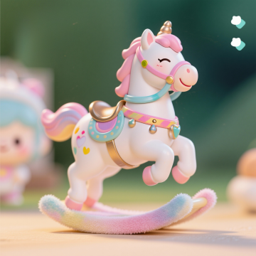 盲盒马,软3D风独角兽摇摇马,融合甜蜜感与可爱感,毛发生长风细节,重拟物塑料质感,卡通风格设计,梦幻节日氛围。