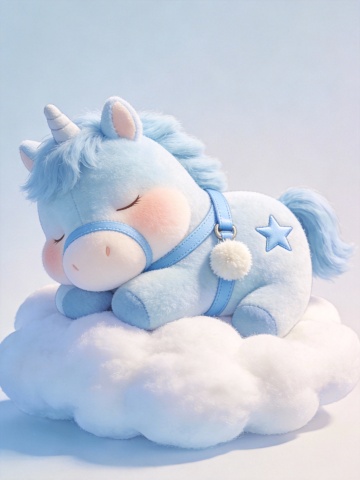梦幻蓝调独角兽,软3D毛绒质感,闭眼安睡于云朵之上,融合毛发生长与面料肌理,营造温馨可爱氛围。