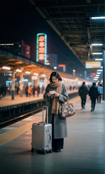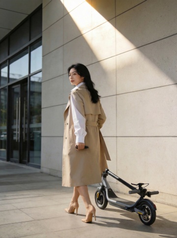 一位黑发亚洲专业产品模特,身穿米色大衣搭配内搭白色衬衣,脚踩裸色高跟鞋,一只手在身后拉着行李箱正在向前走的姿势,背对站立于阳光从斜上方照射,可以看到三分之一的侧脸。背景可见商业楼墙,整体画面采用高清商业摄影风格,柔和顶光照明,简约背景室外环境,模特姿态优雅自然,展现休闲时尚的都市女性气质。