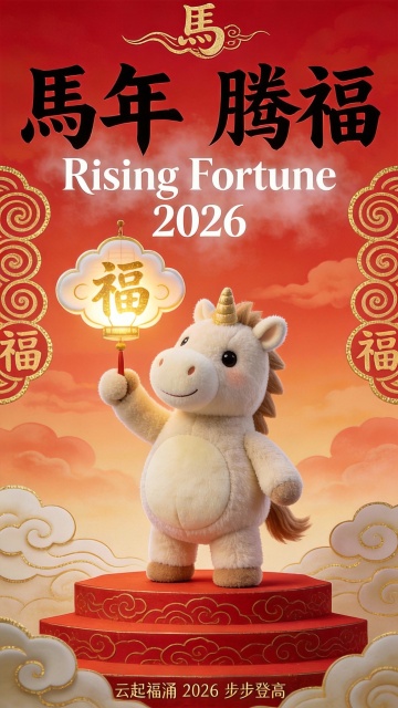 毛绒小马公仔(圆肚浅米色,神态俏皮)站立于红色祥云纹台阶,单手托举云朵形灯笼(内透“福”字金影);背景为绯红渐变云霞,流金勾边;公仔居中偏下;画面上方浑厚黑色隶书“馬年 腾福”,中段飘绕雾白色英文“Rising Fortune 2026”,背景左右对称排列漩涡云纹“福”字,顶部缀流线型“馬”字图腾,底部隐现“云起福涌 2026 步步登高”。