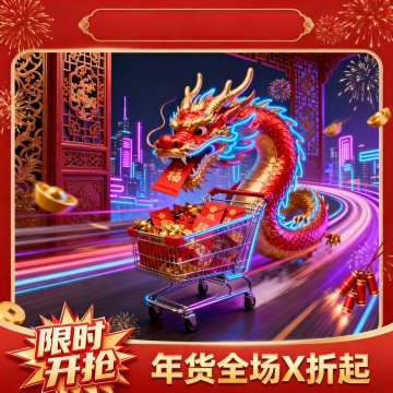 国潮风与霓虹灯风融合,3D重拟物设计,龙形购物车满载红包金锭,穿梭于未来都市,喜庆科技感十足,限时促销氛围热烈。