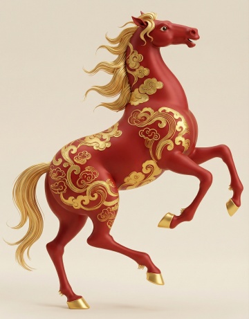 中式风格3D重拟物马,红金配色尽显奢华,鎏金祥云纹饰呼应喜庆氛围,金属质感蹄部彰显节日尊贵。