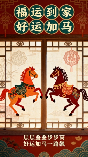 喜庆扁平风设计,四色骏马环绕红灯笼与国风元素结合,营造红火热烈的马年祝福氛围
