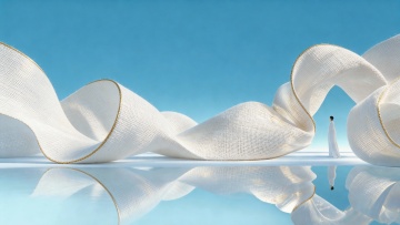 一张具有高端设计感的海报,画面主体为几条飘逸的飘带,采用3D渲染技术,展现出丝绸般细腻光滑的质感,飘带的褶皱和卷曲形态自然流畅,富有动感。整体配色改为清新雅致的淡蓝色与白色渐变,飘带以纯净的白色为主,边缘带有柔和的淡蓝色光晕,营造出宁静、优雅的氛围。光线从画面左上方柔和照射,使飘带表面呈现出细腻的高光和微妙的阴影变化,增强立体感。画面保留大面积的留白,主要集中在右上部分,飘带从左下角向右上方优雅延伸,形成流畅的视觉引导线,整个设计简洁大气,信息传达高效,符合现代审美需求,没有任何文字、LOGO、电话地址及二维码等元素。