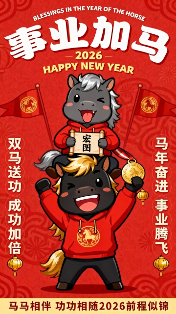 拟人的马,和人一样双脚站立,正面,童趣手绘风格新年插画,平涂色彩,以高饱和度正红色为背景,点缀祥云纹样与钱币图案,画面主体是两只叠放的Q版拟人的马,下方是体型较大的橙色拟人马,搭配深蓝色的鬃毛,大笑,红白黄色新年衣服装饰有黄色 吉祥纹样,举着上方的马;上方是一只浅棕色的拟人马,双手拿着福字,搭配米白色的鬃毛,吐舌头,穿红白黄新年服装有国风纹样,顶部是可爱的白色艺术字体主标题「福气加马」,中间一行加浅黄色艺术字副标题 “2026 HAPPY NEW YEAR”,最上方上方还有弧形排列的小字 “BLESSINGS IN THE YEAR OF THE HORSE”。画面左右两侧是竖排米色小字吉祥语:“双马送喜 福气加倍” 与 “马年行运 福满四季”(左右竖排文字中间各点缀一个灯笼图形)。底部一行浅黄很小字是 “马马相伴 福福相随 2026 好运开道”