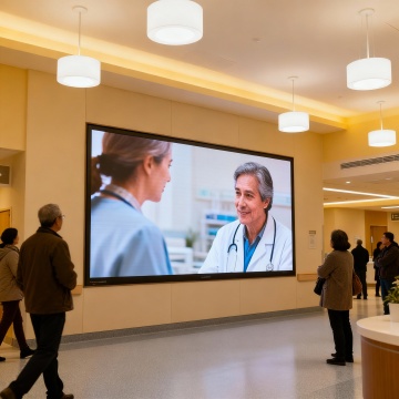 现代化大型医院建筑,玻璃幕墙外立面,顶部红色十字标志,底部为棕色石材基座,建筑整体呈流线型设计,周围环绕着茂密的森林环境,阳光透过树叶洒在建筑上形成斑驳光影,天空呈现柔和的黄昏色调,云彩被染成温暖的橙红色,建筑底部有静谧的人工湖,倒映着医院的轮廓和天空的晚霞,整体氛围宁静而充满希望,具有高度写实的3D建筑渲染风格,细节丰富,光影过渡自然,色彩和谐统一。