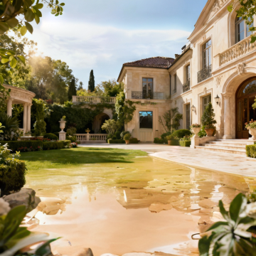 现代简约风格的庭院,阳光明媚的白天,晴朗的蓝色天空点缀着几朵白云,庭院内有一栋两层现代简约风格的白色住宅,住宅外立面有大面积玻璃窗和深色框架,木质大门,门前有几级浅色石阶,周围种植着修剪整齐的绿色灌木、高大的树木和草坪,草坪上有石板小径,整体光影明亮,色彩清新自然,营造出宁静舒适的氛围。