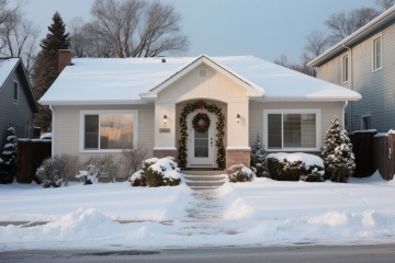 写实风格庭院景观,晴朗白天,明亮的蓝色天空点缀着蓬松的白色云朵,阳光充足,光线柔和,绿色草坪修剪整齐,翠绿鲜亮,位于画面前景,占较大比例。两层白色坡屋顶别墅,灰黑色屋顶,白色墙面带绿色百叶窗,门前有石阶,两侧摆放着种植花卉的花盆,周围环绕着修剪整齐的绿色灌木丛和盛开的红色、白色花朵,右侧有一棵红叶树,整体色彩和谐,氛围宁静舒适,庭院开阔,布局美观,充满生机。