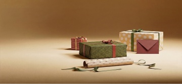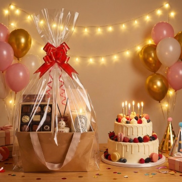 两张用浅棕色牛皮纸包装的礼盒,表面覆盖着白色蕾丝装饰,并用麻绳系成蝴蝶结。礼盒旁边摆放着几朵盛开的白色栀子花和绿色的叶子,整体画面呈现出一种温馨、自然的氛围。
