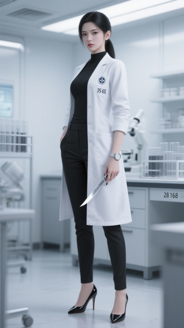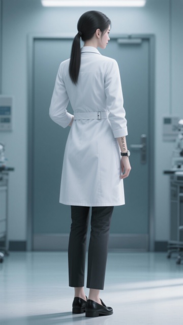 主角:冷感法医苏砚(女,28 岁)​ 核心标签:专业冷静、锐利果决、标志性动作(转解剖刀)、口头禅(“骨头从不说谎”)​ 正面视图描述词:竖屏全身,冷感女法医,168cm 身高,利落低马尾(黑色),五官精致冷冽,眼神锐利,穿纯白色修身白大褂(无褶皱),内搭黑色紧身打底衫,黑色修身西裤,黑色尖头低跟鞋(鞋跟尖锐),左手腕戴简约银色手表(表盖刻 “苏砚”),右手指尖夹着银色解剖刀(刀刃反光),站姿挺拔,背景是冷白色法医工作室(模糊试管架),冷色调光影,细节:白大褂左胸有法医徽章,指甲修剪整齐无装饰​ 侧面视图描述词:竖屏全身侧面,冷感女法医,低马尾贴后颈,侧脸线条流畅,白大褂下摆自然垂坠,西裤贴合腿部线条,尖头鞋鞋跟呈 45° 角,右手自然下垂(解剖刀握在掌心),左手手腕手表表带贴合皮肤,背景模糊(法医工作室器械柜),光影偏暗,突出身体轮廓,细节:白大褂袖口收紧,手表表链有 3 节调节扣​ 背面视图描述词:竖屏全身背面,冷感女法医,低马尾发尾整齐,白大褂背面无图案,腰部有隐形收腰设计,西裤后腰有简约皮带扣,黑色鞋子后跟无装饰,左手腕手表背面有细小刻字(“2020.03.15”),背景是工作室大门(模糊),冷色调,细节:白大褂下摆长度到膝盖下方 3cm,马尾高度在肩胛骨中间
