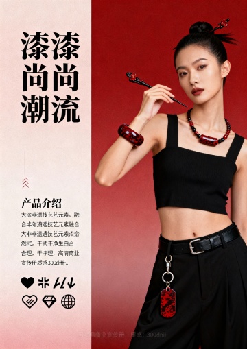 核心风格要求(所有页面通用前缀):国潮风,融合大漆非遗技艺元素(漆色、漆纹、漆工艺细节),现代简约审美,色彩以大漆经典色(朱红、乌黑、明黄、石青)为主,搭配低饱和辅助色,画面细腻有质感,版式干净留白合理,符合品牌年轻化定位,高清商业宣传册质感,300dpi,适合印刷第1页:封面提示词:国潮风品牌宣传册封面,主体展示“漆造”品牌Logo,Logo融入大漆髹涂纹理,背景为渐变朱红大漆底色,点缀细金漆线条勾勒的传统缠枝纹,右上角标注核心定位“千年大漆,玩转出圈”,右下角小字“非遗大漆年轻化品牌”,整体风格大气简约,视觉中心突出,无多余元素第2页:品牌引言·何为漆造提示词:国潮风宣传册内页,左侧大面积留白,用乌黑漆色书写标题“何为漆造”(书法字体),下方配小字“以漆为媒,连接传统与当下”;右侧分上下两个小版块,上方是浅米色背景搭配朱红漆线勾勒的大漆树简笔画,下方是简洁文字区域(文字内容占位符:“漆造,立足大漆非遗年轻化传播,打破技艺认知门槛,让千年漆艺走进当代生活”),画面左侧加1条细石青漆色竖线分割,整体雅致有呼吸感第3页:核心定位·千年大漆 玩转出圈提示词:国潮风宣传册内页,版式左右分栏,左侧朱红大漆底色,用金色字体突出核心定位“千年大漆,玩转出圈”,背景暗纹为大漆推光工艺的细腻光泽纹理;右侧浅灰色背景,上方是“定位解读”标题(石青漆色),下方用简洁图标+文字占位符呈现核心逻辑:“传统漆艺传承+潮流载体创新+情感互动体验”,每个逻辑点搭配简约漆艺元素图标(漆刷、潮流配饰、握手符号)第4页:非遗底蕴·大漆的千年传承提示词:国潮风宣传册内页,上方通栏展示大漆技艺历史场景简绘(低饱和度水墨风格,描绘古代工匠髹漆场景),下方分两栏,左栏标题“大漆非遗的文化内涵”(乌黑漆色),配朱红漆色细边框;右栏标题“千年技艺的当代价值”(乌黑漆色),同样配朱红漆色细边框,两栏均预留文字占位符区域,背景点缀细微漆粉质感纹理第5页:品牌Logo设计解析提示词:国潮风宣传册内页,左侧主体展示“漆造”Logo完整图形,Logo采用朱红与乌黑撞色,融入大漆缠枝纹与“漆”字意象,右侧分三个小版块,分别标注“色彩寓意”“纹样灵感”“字体设计”,每个版块搭配对应简约图标(调色盘、缠枝纹、字体符号),背景为浅米色,所有分割线采用石青漆色,突出设计细节第6页:品牌IP形象·漆小匠提示词:国潮风宣传册内页,左侧大面积展示IP形象“漆小匠”全身图(卡通形象,身着融合漆艺元素的潮流服饰,手持漆刷,面带微笑,形象活泼可爱),右侧展示IP三个不同动作表情(挥手、举产品、讲解漆艺),下方标注IP形象定位“漆艺文化传播小使者”,背景为浅灰色,点缀朱红漆色小圆圈装饰,整体风格童趣且不失国潮质感第7页:产品系列总览·漆造好物提示词:国潮风宣传册内页,上方通栏标题“漆造好物·三大产品系列”(朱红漆色书法字体),下方三栏均等分布,每栏展示一个产品系列的代表性产品缩略图(搭配简约文字标题:“生活美学系列”“潮流配饰系列”“文化纪念系列”),每个缩略图背景为乌黑漆色,点缀细金漆线条,整体版式规整,层次分明第8页:生活美学系列·漆韵日常提示词:国潮风宣传册内页,左侧展示3件生活美学系列产品(漆盘、漆杯、漆收纳盒),产品摆放错落有致,搭配简约绿植点缀,背景为浅米色,突出产品的大漆质感(推光光泽、纹理细节);右侧为文字区域,标题“漆韵日常”(石青漆色),下方预留产品介绍文字占位符,加朱红漆色细边框装饰第9页:生活美学系列·细节质感提示词:国潮风宣传册内页,采用多图拼接版式,展示生活美学系列产品的细节特写(漆盘的缠枝纹雕刻细节、漆杯的髹涂纹理、收纳盒的开合处工艺),每个特写图搭配简约文字标注(“缠枝纹雕刻”“多层髹涂”“手工打磨”),背景为乌黑漆色,用金色线条分割画面,突出大漆技艺的精湛细节,整体风格高端有质感第10页:潮流配饰系列·漆尚潮流提示词:国潮风宣传册内页,右侧展示4件潮流配饰系列产品(漆手镯、漆项链、漆发簪、漆钥匙扣),产品佩戴在模特手上/颈部(模特只露局部,突出产品),背景为朱红渐变漆色;左侧为文字区域,标题“漆尚潮流”(乌黑漆色),下方预留产品介绍文字占位符,搭配潮流元素图标(爱心、潮流符号),整体风格时尚动感第11页:潮流配饰系列·个性定制提示词:国潮风宣传册内页,左侧展示个性定制流程示意图(图标+文字:选款式→选漆色→加纹样→完成定制),背景为浅灰色,分割线用朱红漆色;右侧展示2件定制款配饰(刻有专属文字的漆手镯、定制纹样的漆项链),产品特写,背景为石青漆色,突出定制的独特性,整体版式清晰易懂第12页:文化纪念系列·漆承文脉提示词:国潮风宣传册内页,上方通栏展示文化纪念系列代表产品(漆制书签、漆制摆件、漆制礼盒),摆放在简约木质展示架上,背景为浅米色,点缀传统文化元素(竹简、印章);下方为文字区域,标题“漆承文脉”(朱红漆色书法字体),预留产品介绍文字占位符,整体风格庄重且有文化底蕴第13页:情感互动·漆艺体验活动提示词:国潮风宣传册内页,左侧展示漆艺体验活动场景简绘(多人参与手工髹漆,氛围轻松愉悦,低饱和度色彩),右侧分两个版块,上方标题“漆艺互动·传承有你”(石青漆色),下方列出2个核心体验活动(“手工漆杯制作工坊”“漆纹拓印体验”),每个活动搭配对应图标(