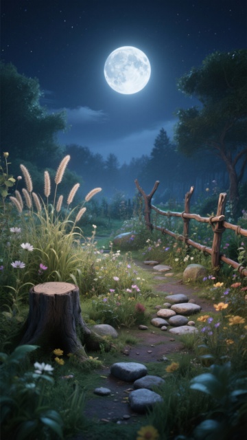 插画风与3D结合,梦幻光影映照静谧湖面,金桂树在月光下绽放,唯美感与浪漫感交织,虚拟自然中的中秋意境。