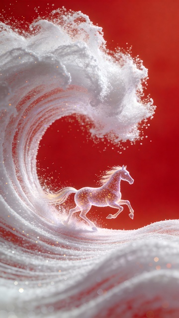 鎏金粒子勾勒奔马踏浪,国潮风韵融梦幻云海,喜庆红底映中式祥瑞,节日氛围跃然纸上。