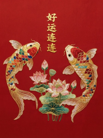 国潮风刺绣质感金鱼衔红包,重拟物浮雕设计,搭配喜庆红金配色,卡通可爱形象传递招财进宝节日祝福。