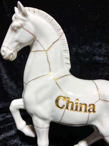 工笔风瓷马,鎏金修补纹路,浮雕质感,古典中式优雅,奢华细节彰显东方韵味。