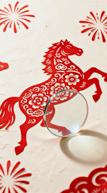 萌趣国风写实风设计,红棕陶瓷小马与祥云纹样结合,营造红火喜庆的马年氛围