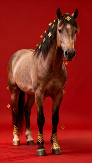 鎏金装饰的骏马,融合中式古典与欧洲宫廷艺术,重拟物风格呈现奢华民族感,红底衬托华贵气韵。