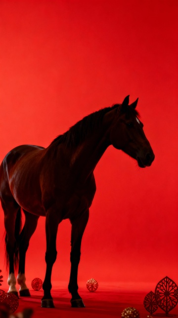 国潮风与鎏金风交融,骏马立于红幕前,金丝带与繁花点缀,营造喜庆奢华的实景感,唯美感与优雅感并存,宛如油画中走出的节日画卷。