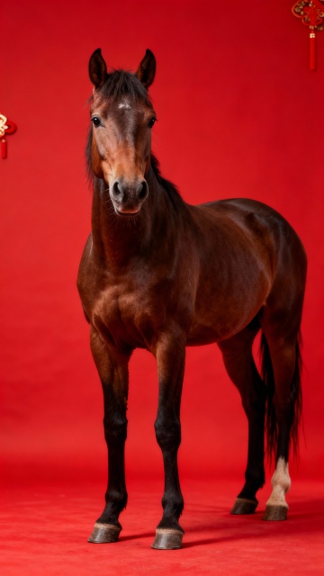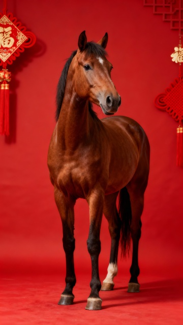 红底鎏金祥云点缀,骏马昂首立于实景之中,融合中式美学与国潮风韵,喜庆大气,寓意新春吉祥。