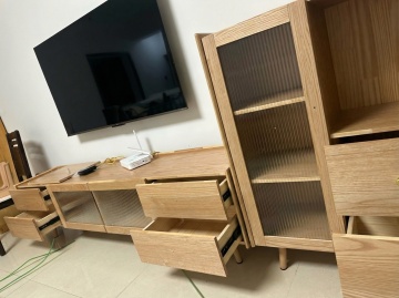 现代简约风边柜,融合性冷淡与轻拟物设计,弧形玻璃门与柔和配色营造温馨舒适感,搭配抽象画作与自然元素,展现文艺氛围。