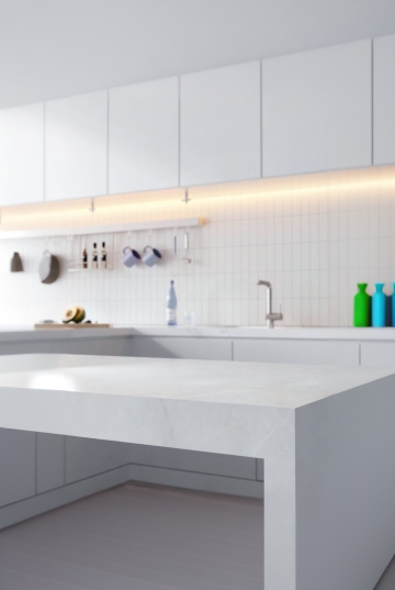 软3D风格的现代简约厨房场景,整体采用明亮的白色调为主,搭配原木色的温暖点缀,营造出清新自然且宁静舒适的氛围。画面以大理石纹理的白色厨房台面为视觉焦点,台面上放置一个浅绿色的盘子,里面装有几颗鲜红饱满的西红柿和被切开的青柠。台面右侧边缘有一个木碗,里面放着一个黄色的柠檬。背景中,白色的橱柜带有简约的木质把手,橱柜上方的墙壁上挂着一个木质挂杆,上面挂着几条浅色的毛巾和几个不同大小的木质锅铲、汤勺。灶台位于左侧,上面有一个银色的锅具,旁边的台面上摆放着装有各种香料的玻璃罐、一个木质砧板以及盛放着彩色水果的木盘。右侧窗户透进柔和的自然光,在台面和橱柜上形成清晰而柔和的光影效果,光线明亮且均匀,阴影过渡自然。整体画面构图遵循三分法,物体摆放错落有致,空间感强,细节丰富,具有柔和的3D质感和平滑的材质表现,色调和谐统一,给人一种干净整洁、温馨宜居的感觉。