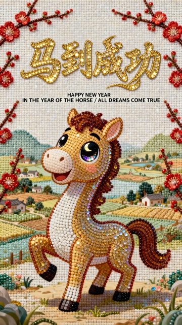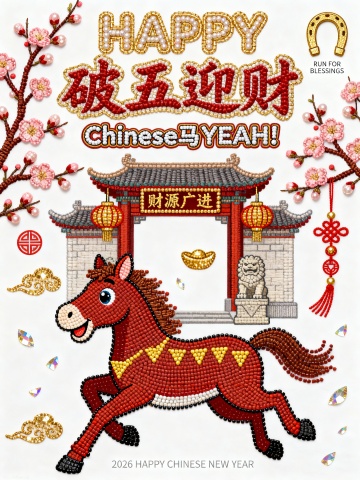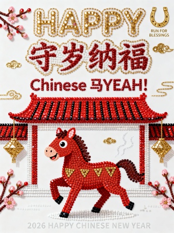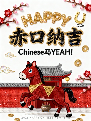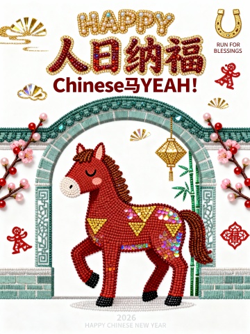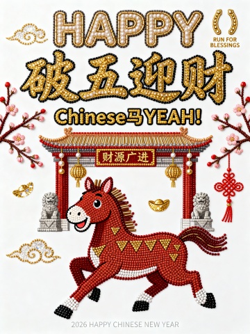 画面上半部分充满了极具视觉冲击力的字体设计,占据画面一半 的比例。最上方是带有粗犷的金色外描边圆润英文单词 “HAPPY”,紧挨着下方是笔画洒脱且充满活力的核心汉字标题 “奔出福运”,标题正下方是一行醒目的slogan “CHINESE 马Ye!”,整体文字排版紧凑,营造出热闹的节日氛围。画面右上角还有一个金色的马蹄铁符号以及极小的英文 “RUN FOR BLESSINGS”。画面下半部分的主体是一匹通体枣红的卡通骏马,马身昂扬挺立,四蹄呈奔跑姿态,占据了画面的底部,马身表面绘有金黄色的 “△” 形纹理代表鬃毛与斑纹。马头位于左侧,双眼圆睁,表情灵动,头顶竖着一对俏皮的耳朵。背景是一座扁平化风格的中式牌坊建筑,屋顶是耀眼的大红色,上面画着黑色的横线表示瓦片,屋檐下左右两侧各悬挂着一盏金色的菱形灯笼。画面左右两侧装饰着朱红色的梅花枝,枝头绽放着粉嫩的花苞。空中散落着几片简单的金色祥云。底部正中央写有微小的白色文字:“2026 HAPPY NEW YEAR”。白色背景