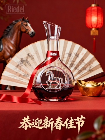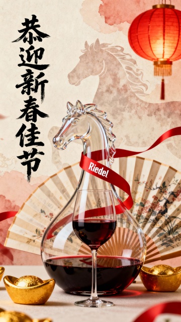 红色Riedel品牌LOGO丝带贯穿马年造型的醒酒器,里面倒了部分红酒,醒酒器背后是中国折扇和元宝等装饰元素,背景融合马的元素与灯笼,搭配书法文字“恭迎新春佳节”,营造新春欢快吉祥如意的新春海报图。比例3:4