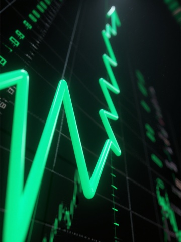 赛博朋克风格的金融数据可视化背景,深蓝色与霓虹粉为主色调,光影呈现科技感十足的网格光线与动态数据流,前景是发光的红色上升曲线图与蓝色网格线交织,背景为模糊的未来城市夜景,整体画面具有强烈的景深效果和玻璃质感,数据线条流畅且充满科技动态感,营造出高端、专业的金融科技氛围。