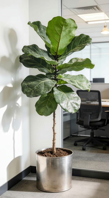 3D渲染的室内绿植,白色背景,一株茂盛的琴叶榕,深绿色的提琴形状大叶片自然舒展,茎干直立,栽种在表面带有细微纹理的白色陶瓷花盆中,花盆底部放置一个浅色圆形木质托盘,整体光影柔和,叶片边缘有自然高光,阴影清晰投射在背景上,植物形态饱满,细节精致,具有真实的材质感和立体感。
