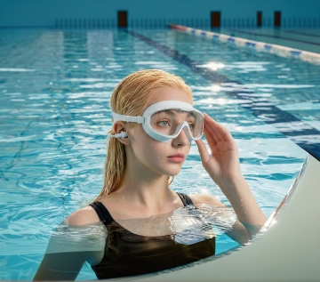 救生衣穿在人的身上,并漂浮在泳池中