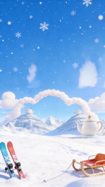 科技感与拟人风融合,3D渲染手持风扇戴毛线帽围巾,置身雪景,轻拟物设计搭配粒子水珠,营造冬日梦幻清爽氛围。