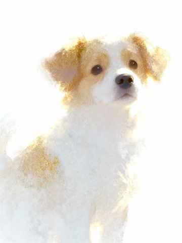 梦幻水彩风小狗,朦胧柔和光影中毛发轻盈生长,温馨插画感扑面而来,如晨曦中的温柔守候。