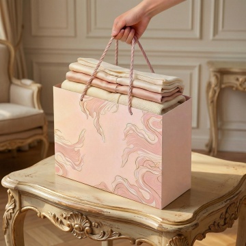 极简主义风格白色手提袋,袋身采用厚实挺括的哑光白色卡纸材质,表面光滑无纹理,搭配灰绿色宽扁状皮质手提带,手提带与袋身连接处有精致的缝线细节,袋子放置于浅灰色光滑水泥台面上,整体呈现出柔和的侧上方自然光照射效果,光线在袋身侧面形成自然的明暗过渡阴影,水泥台面反射出微弱的光泽,背景更换为简约的米白色渐变磨砂质感墙面,手提袋样式调整为底部带有细微内收弧度的梯形轮廓设计,整体画面保持干净、高级、简约的静物摄影氛围,色彩统一在低饱和度的灰白绿配色体系中,突出材质的细腻质感和光影的微妙变化。