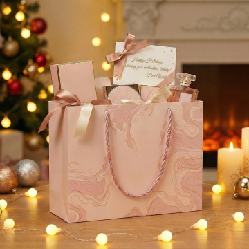 极简主义风格的棕色牛皮纸袋,配有自然色绳制手提带,袋子表面有细腻的压纹图案,整体呈现出干净利落的立体剪裁,柔和的侧光照射在袋身形成自然的明暗过渡,阴影简洁地投射在纯白色背景上,展现出简约而富有质感的静物美学。