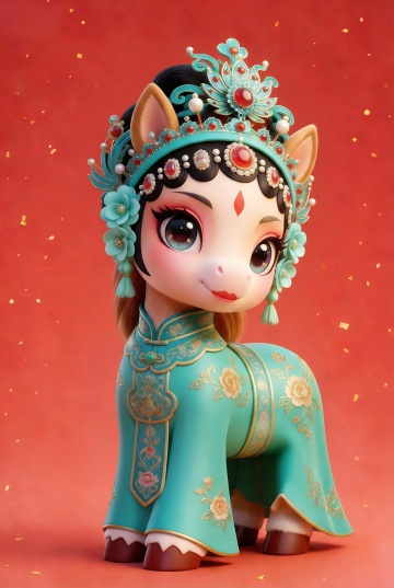 软3D风格的拟人小马,身着国潮风刺绣旗袍,头戴鎏金花冠,融合中式元素与可爱卡通感,喜庆红底衬托民族风情,尽显节日欢愉。