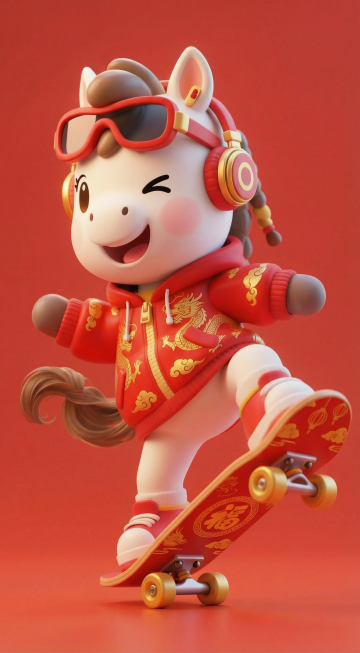 软3D风拟人小马,身着国潮红金龙纹外套,戴墨镜耳机,踩滑板欢庆新春,萌趣十足,喜庆洋溢。