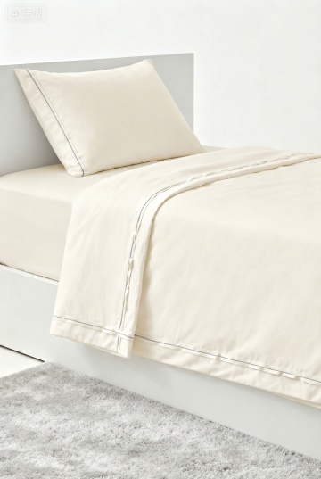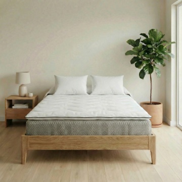 一张温馨的卧室场景,中央是一张铺着棕色床垫的床,床垫表面柔软舒适,带有自然的纹理。阳光透过窗户洒在床垫上,形成温暖的光斑。床头柜上摆放着一盏柔和的台灯和一盆绿色植物,整体色调温暖柔和,营造出舒适、放松的居家氛围。