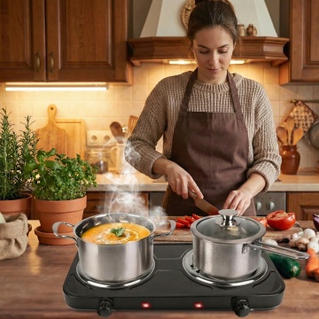 现代简约风格厨房场景,自然光透过窗户洒入,白色台面搭配深棕色木质橱柜,台面中央放置黑色电磁炉,屏幕显示红色数字,周围摆放装有芒果块的白色盘子、盛有蔬菜沙拉的白色餐盘、混合果蔬小碗、橙色水果,旁边有木质砧板和灰色餐布,透明玻璃花瓶插着白色花朵,背景可见不锈钢水龙头和水槽,整体氛围明亮整洁,充满生活气息,细节清晰,光影柔和自然。