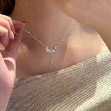 写实珠宝摄影风格,铂金项链吊坠特写,中央镶嵌一颗圆形明亮式切割主钻,周围环绕小钻形成双层环形设计,银色链条自然垂落,钻石具有强烈的火彩和内部闪光,高反光金属质感,柔和侧逆光营造出清晰的阴影和高光层次,背景替换为蓝色天鹅绒质地,表面有细腻的光泽纹理,整体画面呈现奢华、精致、高雅的氛围,焦点锐利集中在吊坠,链条和背景有轻微虚化,突出珠宝的璀璨光芒和细节质感。