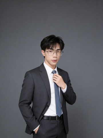 商务感十足的男性肖像,灰色调背景营造性冷淡风,简约主义构图突出人物专业气质,柔和光线增强舒适感,印刷风质感强化视觉层次。