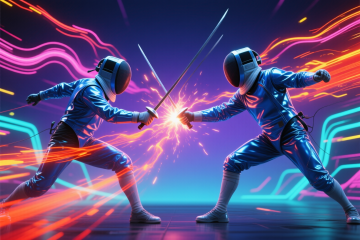 未来感十足的3D虚拟赛道,科技蓝光影交织,几何体悬浮飞舞,金属与玻璃质感碰撞,展现速度与数字美学的融合。