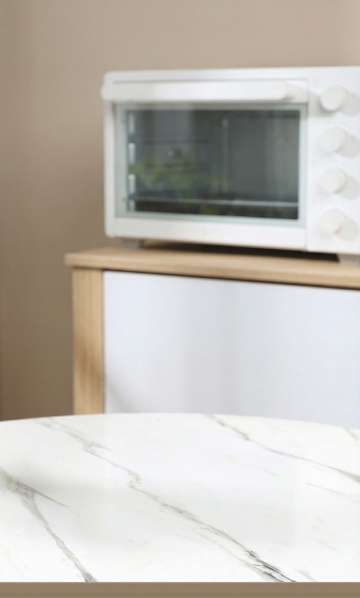 极简主义风格台面设计,纯净白色台面搭配白色背景墙,右上角放置透明玻璃花瓶,瓶中插有黄绿色系植物,柔和自然光从左上角斜射,在墙面和台面上形成清晰的几何条状光影,整体色调以白色、浅灰色和黄绿色为主,配色简洁明快,画面构图平衡,光线柔和,营造出宁静、干净、通透的氛围,台面下方可见浅灰色柜体的局部。